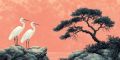 Tranquility in Pink: Two Egrets Under a Sprawling Pine Tree