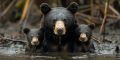 Serene Moment with a Florida Black Bear and Her Cubs in a Swamp