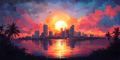 Vibrant Sunset Over Miami: A Lush, Artistic Urban Landscape