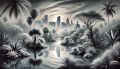 Enigmatic Monochrome Vision of Miami's Skyline Amidst Tropical Flora