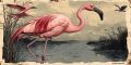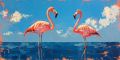 Vibrant Flamingos Against a Stylized Blue Ocean Background