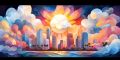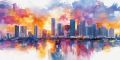 Vibrant Watercolor Reflections of Miami's Skyline at Sunset
