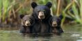 A Mother's Vigilance: Black Bear and Cubs in a Serene River