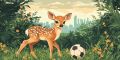 Whimsical Deer Playfully Kicking a Soccer Ball in a Lush Meadow