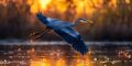 Majestic Great Blue Heron Amidst a Fiery Autumnal Sunset